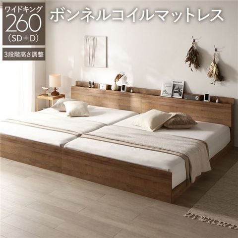 ベッド ワイドキング 260 SD+D ボンネルコイルマットレス付 シャビーオーク 連結 高さ調整可 宮付 すのこ 【同梱不可】【代引不可】[▲][TP]