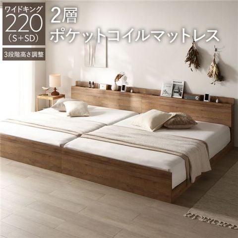 ベッド ワイドキング 220 S+SD 2層ポケットコイルマットレス付 シャビーオーク 連結 高さ調整可 宮付 すのこ 【同梱不可】【代引不可】[▲][TP]のレビュー