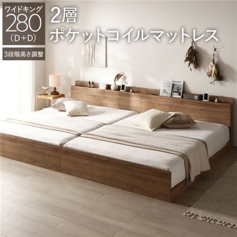 ベッド ワイドキング 280 D+D 2層ポケットコイルマットレス付 シャビーオーク 連結 高さ調整可 宮付 すのこ 【同梱不可】【代引不可】[▲][TP]