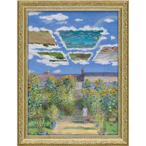 ●モネの「ヴェトゥイユガーデン」の空を見上げた少女と愛犬、モネの名画5作品がぷかぷか浮かんでいます。