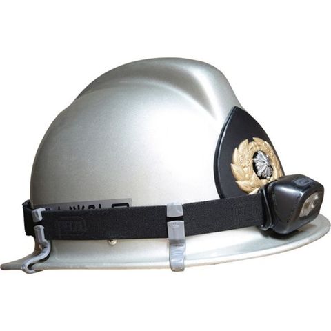 縁の厚いヘルメットにヘッドランプを取り付ける。