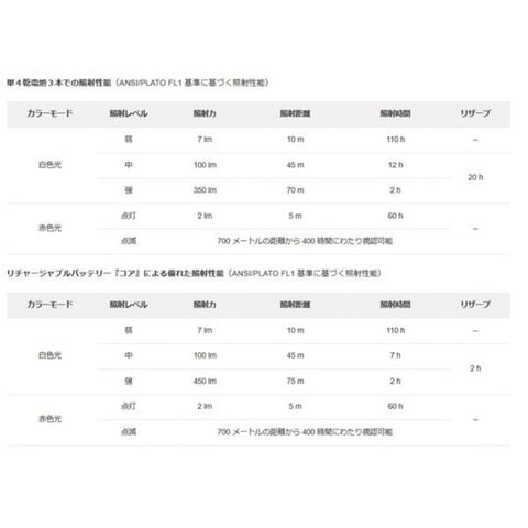 均質で快適な近距離照射ができます。むらの無い均質なワイドビームにより、至近距離や足元の快適な視界が得られます。弱、中(照射力と照射時間の良好なバランス)、強、3つの照射レベルがあります。自分や周囲の人の目を眩ませることなく視界を保つ赤色光の点灯、特に緊急事態において自らの位置を知らせるシグナルとして赤色光が点滅します。1つのボタンにより素早く簡単に照射レベルの選択が可能です。プレートにより、ランプの向きを自由に変えられます。ランプを点灯または消灯する際、インジケータによりバッテリーの残量を確認できます。暗闇でもランプを探しやすい蓄光リフレクター付です。保管や持ち運びの際、偶発的にオンにならないようにロックする機能を備えています。ヘッドバンドは取り外し、洗浄可能で左右対称なため容易に調節できます。リフレクター付きヘッドバンドにより、照射レベルを下げても視認性を保つことができます。付属のポーチとともにランタンとしても使用できます。ハイブリッドコンセプトにより、付属の乾電池3本または別売のリチャージャブルバッテリー(コア)で使用可能です。電源を感知することで、電源に応じて照射性能が調節されます。マウント「ヘルメット アダプト」「バイク アダプト」の両方に対応するため、ランプを様々なタイプのヘルメットや自転車に取り付け可能です。