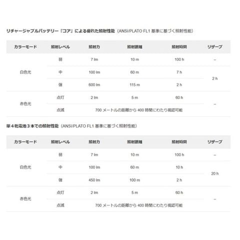 行動中やダイナミックなアクティビティでの使用に適した汎用性が高く快適な光です。むらの無い均質なワイドビームにより、至近距離や足元の快適な視界が得られます。ミックスビーム (ワイドおよびスポット) により、近距離と遠距離の視界が得られます。弱、中(照射力と照射時間の良好なバランス)、強、3つの照射レベルがあります。自分や周囲の人の目を眩ませることなく視界を保つ赤色光の点灯、特に緊急事態において自らの位置を知らせるシグナルとして赤色光が点滅します。1つのボタンにより素早く簡単に照射レベルの選択が可能です。プレートにより、ランプの向きを自由に変えられます。ランプを点灯または消灯する際、インジケータによりバッテリーの残量を確認できます。USB ポート(Micro B)により再充電可能です。暗闇でもランプを探しやすい蓄光リフレクター付です。保管や持ち運びの際、偶発的にオンにならないようにロックする機能を備えています。ヘッドバンドは取り外し、洗浄可能で左右対称なため容易に調節できます。リフレクター付きヘッドバンドにより、照射レベルを下げても視認性を保つことができます。付属のポーチとともにランタンとしても使用できます。ハイブリッドコンセプトにより、付属のリチャージャブルバッテリー(コア)または別売の乾電池3本で使用可能です。電源を感知することで、電源に応じて照射性能が調節されます。マウント(ヘルメット アダプト)(バイク アダプト)の両方に対応するため、ランプを様々なタイプのヘルメットや自転車に取り付け可能です。