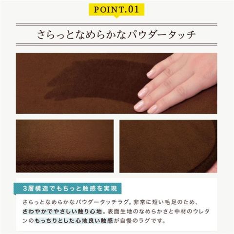 なめらかでさらっとした触り心地のラグ。マットな質感とシンプルなデザインで、フローリングのお部屋にピッタリ。短め毛足で髪の毛やゴミが絡まりにくいので、掃除もラクチン。夏はサラっと快適に、冬場はホットカーペットカバーとしてもご使用になれます。