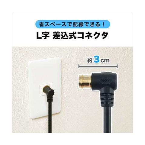 L字差込式コネクタは、狭い隙間にあるアンテナコンセントへの接続に最適です。機器にはもう一方のネジ式コネクタでしっかりと接続ができます。