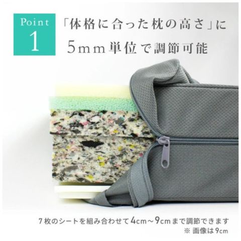 ●外寸:枕本体=奥行約25×幅約60×高さ約4~9cm(5mm単位で調節可)、専用枕カバー=奥行約26×幅約70×マチ約8cm