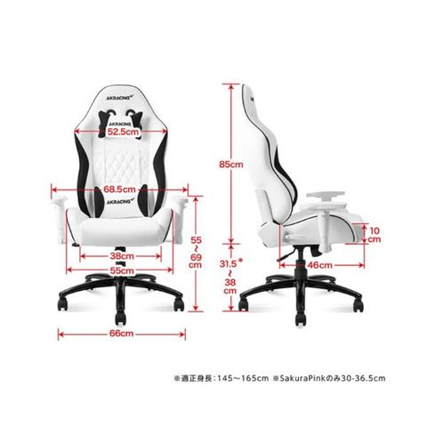 ●小学校高学年~中学生のユーザーを想定し、適正身長を145cm~165cmに設定して設計されたティーンエイジャー向けモデル。PINONゲーミングチェア、色はサクラピンクです。