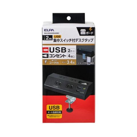 ELPA 集中スイッチ付デスクタップ(外せるクランプ付) 4個口+2ポート 2m ブラック WLS-DS4232SUA(BK) 1個 【同梱不可】【代引不可】[▲][TP]