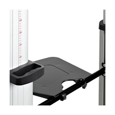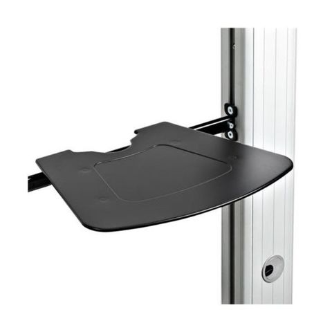●ウェブカメラやメディア機器の収納に便利な2つの収納棚つき(棚一枚あたり耐荷重5kg、ディスプレイとは別に高さ調節が可能)。上の棚は2.4mまで、下の棚は0.72mまで床からの高さを別々に調整可能。
