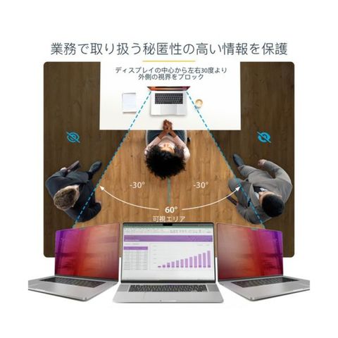 ●正面を中心に約60度(左右約30度)より外側からの覗き見を防止するマイクロルーバー技術を採用。ミラー効果面へ素早く遷移するゴールド仕上げにより、スクリーン上の機密データを保護するモニター用プライバシースクリーンプロテクター。