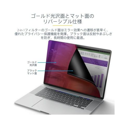 ●色の鮮やかさを保ちながらプライバシーを最大限に保護するゴールド仕上げの光沢面と、指紋が付きにくいコーティングを施したアンチグレアマット(無光沢)面の両面使用が可能。着脱可能なデザインにより、裏表の交換が可能。