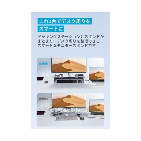 ●多機能ドッキングステーションとスタンドが一つになったスマートなモニタースタンド。様々な機器をこれ1台で接続しつつ、スタンド下のスペースにキーボードやマウスなどの周辺機器をスマートに収納することができ、デスク周りをすっきりと整理できます。