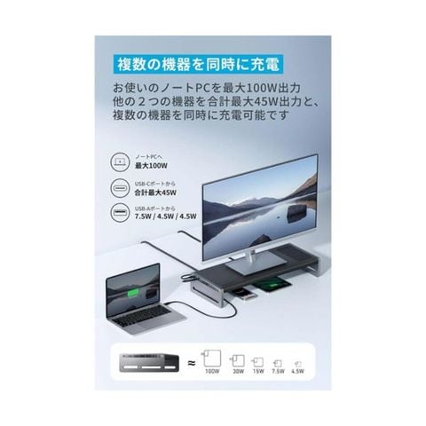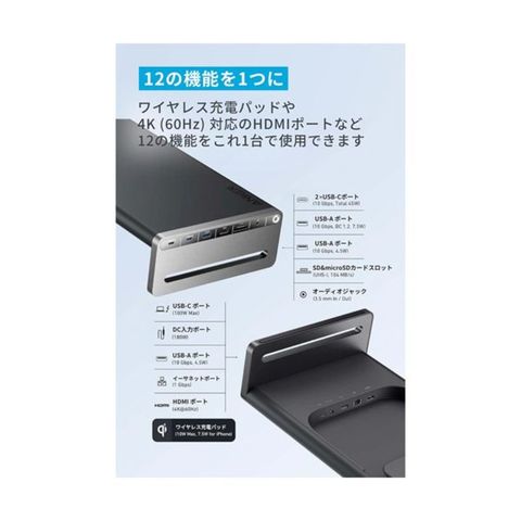 ●搭載ポート:ワイヤレス充電パッド(5W/7.5W/10W)×1、USBPD対応USB-Cアップストリームポート(最大100W)×1、USB 3.2 Gen2 USB-Cポート(最大10Gbps合計45W)×2、USB 3.2 Gen2 USB-A ポート(最大10Gbps 7.5W)× 1、USB 3.2 Gen2USB-A ポート(4.5W)×2、最大4K(60Hz)対応HDMIポート×1、3.5mmオーディオジャック×1、イーサネットポート(最大1Gbps)×1、microSDカードスロット×1、SDカードスロット×1