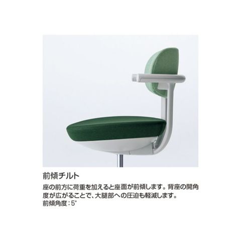 ●座の前方に荷重を加えると座面が前傾し、背座の開角度が広がることで、大腿部への圧迫も軽減。 前傾角度は5°です。