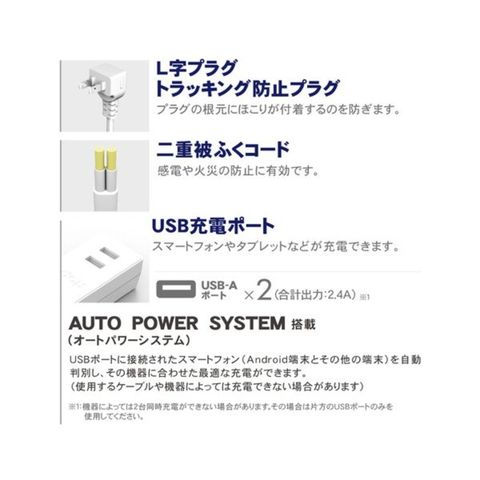 ●オートパワーシステム搭載で、USBポートに接続されたスマホ(Android端末とその他の端末)を自動判別し、その機器に合わせた最適な充電ができます。(使用するケーブルや機器によっては充電できない場合があります。)