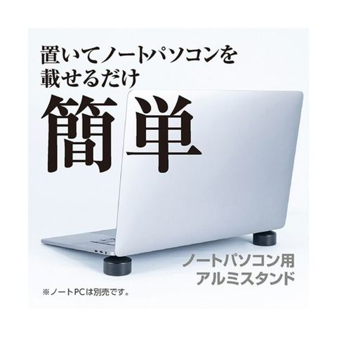 ●ノートパソコンやタブレットを置いて角度調節ができるアルミスタンド、色はブラックです。