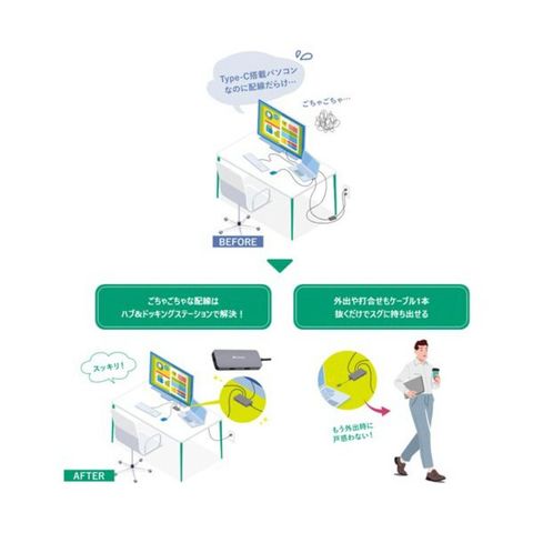 ●コネクタ形状:HDMI Type-A メス(Max 8K/30Hz(7680×4320)at DP1.4、Max4K/60Hz(3840×2160)at DP1.2)×1、HDMI Type-A メス(Max 4K/30Hz(3840×2160))×1、VGA メス×1、USB Type-A(USB 3.2 Gen1/2.0(max5Gbps))×3、USB Type-A(USB 2.0(max 480Mbps))×2、USBType-C(PD対応給電ポート(データ転送非対応)max 85W)×1、USB Type-C(USB 3.2 Gen1 /2.0)×1、RJ-45(10BASE-T/100BASE-TX/1000BASE-T)×1、SDcardスロット×1、microSD cardスロット×1、3.5mm Audio & Microphone×1