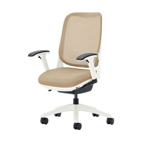 ●フレキシブルアームで背座色サンドベージュ(ホワイト脚・フレームはホワイト)のオフィスチェア「ライド」。