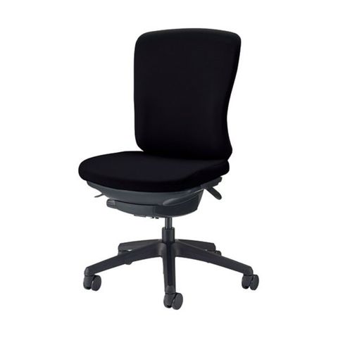 ●ひとり一人に快適な座り心地をサポートする調節機能が付いた、布張りのミドルバックオフィスチェアー。フレキシブルアームで座面と脚ベースとシェルがブラックタイプです。