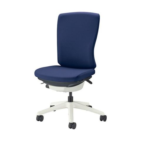●ひとり一人に快適な座り心地をサポートする調節機能が付いた、布張りのハイバックオフィスチェアー。アームレスで座面がコズミックブルーで脚ベースとシェルがホワイトタイプです。