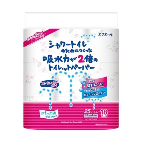 ●水分をたっぷり吸収するのでシャワートイレも快適。フラワープリント香水付きの18ロール×4パック。