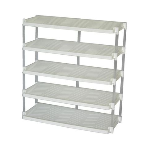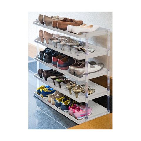 ●靴やスリッパなど最大15足(3足×5段)収納できる便利なシューズラック。色はホワイトです。