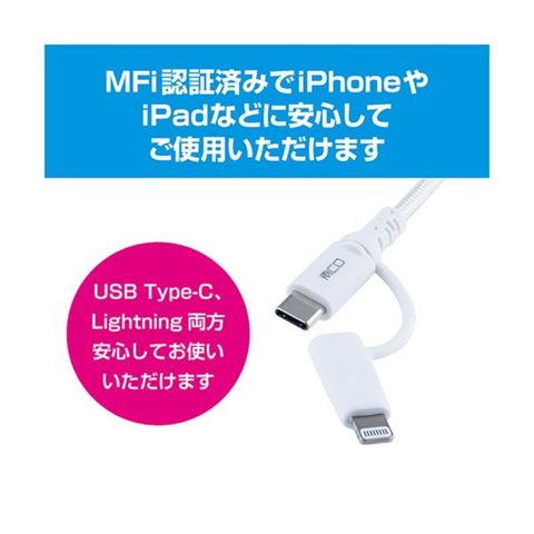 ●Lightning 端子、USBType-C端子を1本で使えます。複数の機器を持っている方や、なるべくケーブルを減らしたい方にもおすすめです。