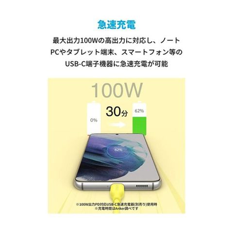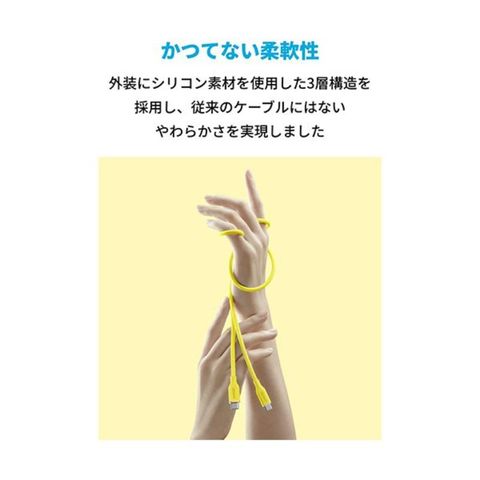 ●ケーブル内部の銅線をグラフェンで覆い、外装にシリコン素材を使用した3層構造を採用し、やわらかさを実現したレモンイエローのUSB-Cケーブル。長さは約1.8mです。
