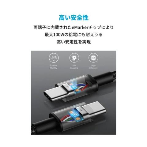 ●両端子に内蔵されたeMarkerチップにより、最大100Wの給電にも耐えうる高い安全性を実現しました。長さ1.8m、色はブラックです。