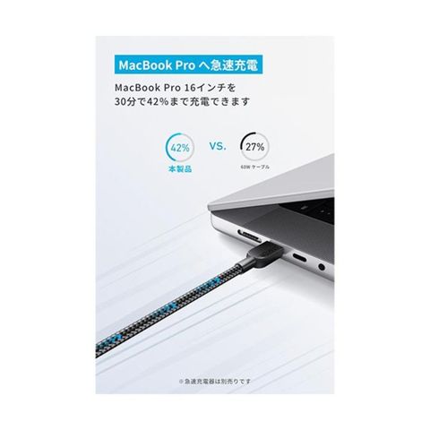●MacBook Pro 16型を30分で42%まで充電できます。