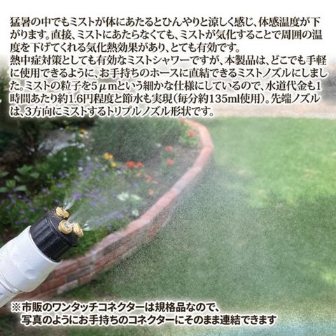 どこでも手軽に使用できるように、お手持ちのホースに直結できるミストノズルにしました。