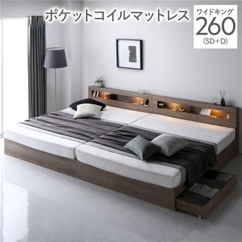 ベッド ワイドキング 260 SD+D 3ゾーン ポケットコイルマットレス付 グレージュ 連結 照明 宮付 収納ベッド 【同梱不可】【代引不可】[▲][TP]