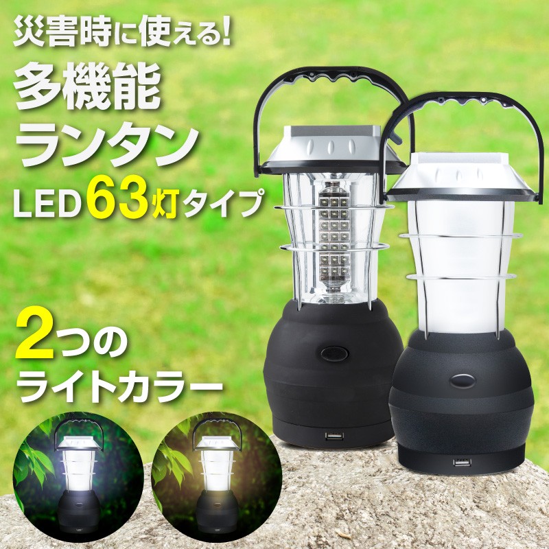 63灯 LED ランタン [5通りの充電方法] 充電式 ソーラー USB 手回し シガーソケット 電池 アンティーク おしゃれ 防災 車載充電 アウトドア 懐中電灯 手動発電 散歩 地震 停電 モバイルバッテリー 夏特集