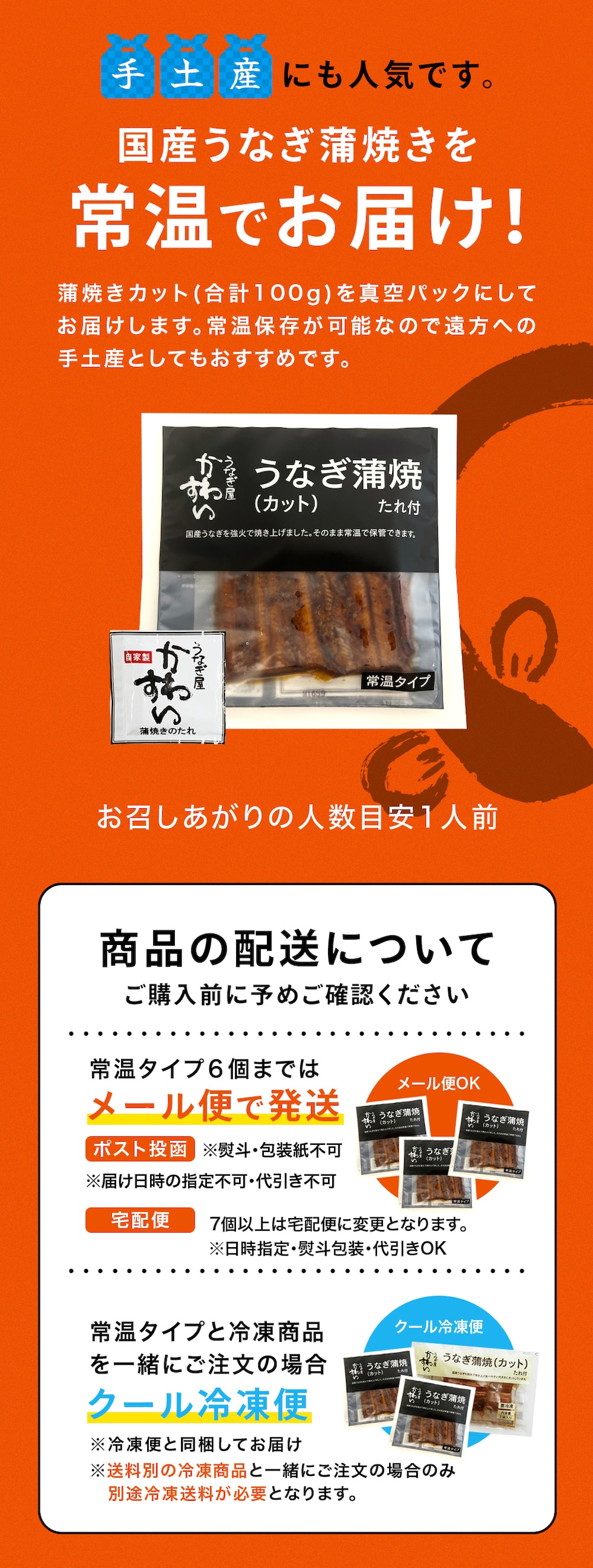 ・(常温)国産うなぎ蒲焼きカット(100g) ・たれ20g×1個 |