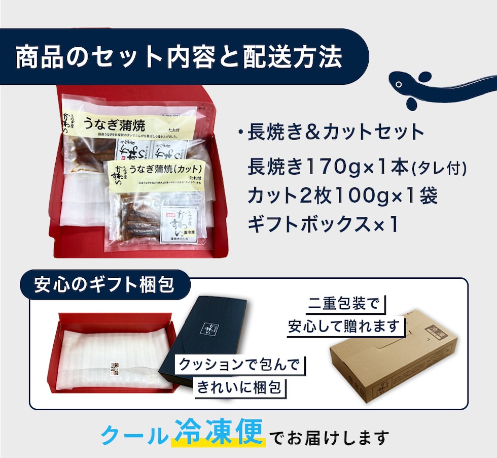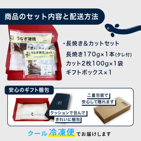 ・特大うなぎ蒲焼き170g×1本 ・うなぎ蒲焼きカット2枚で100g ・たれ小袋×4個 ・黒木目調ギフトボックス |