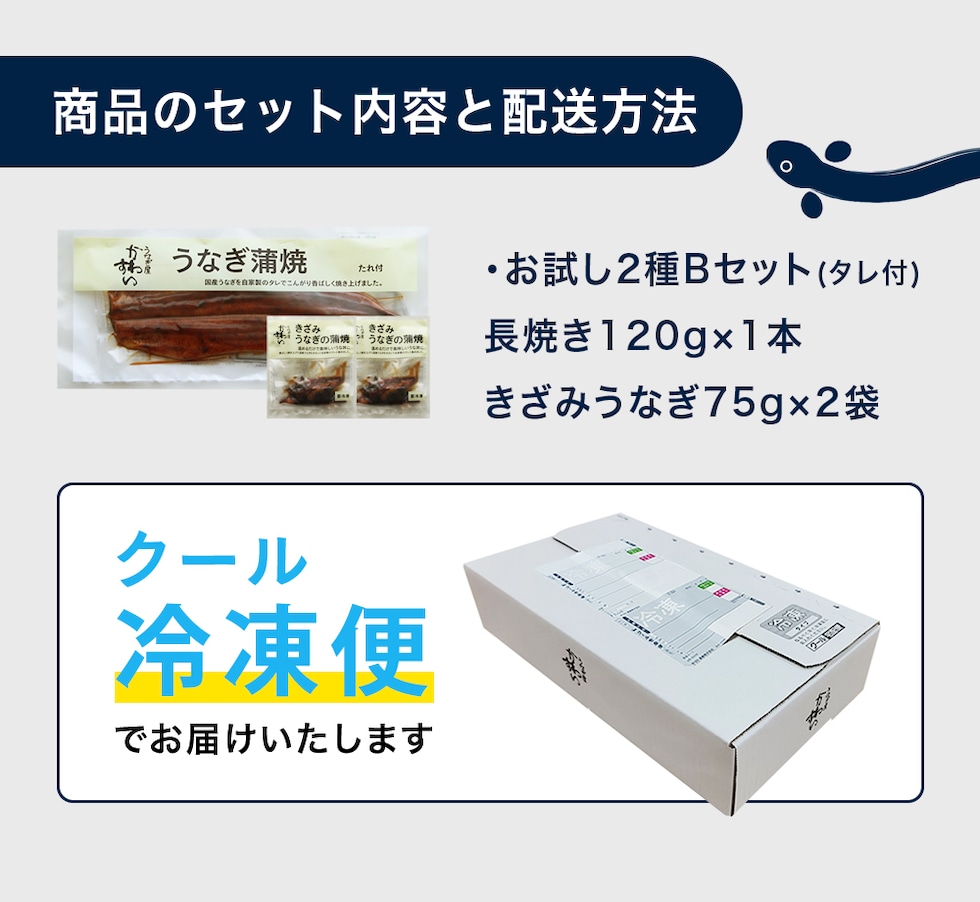 ・うなぎ蒲焼き120g×1本 (タレ2個) ・きざみうなぎの蒲焼き75g×2食 (1食あたり/うなぎ50g タレ25g) |