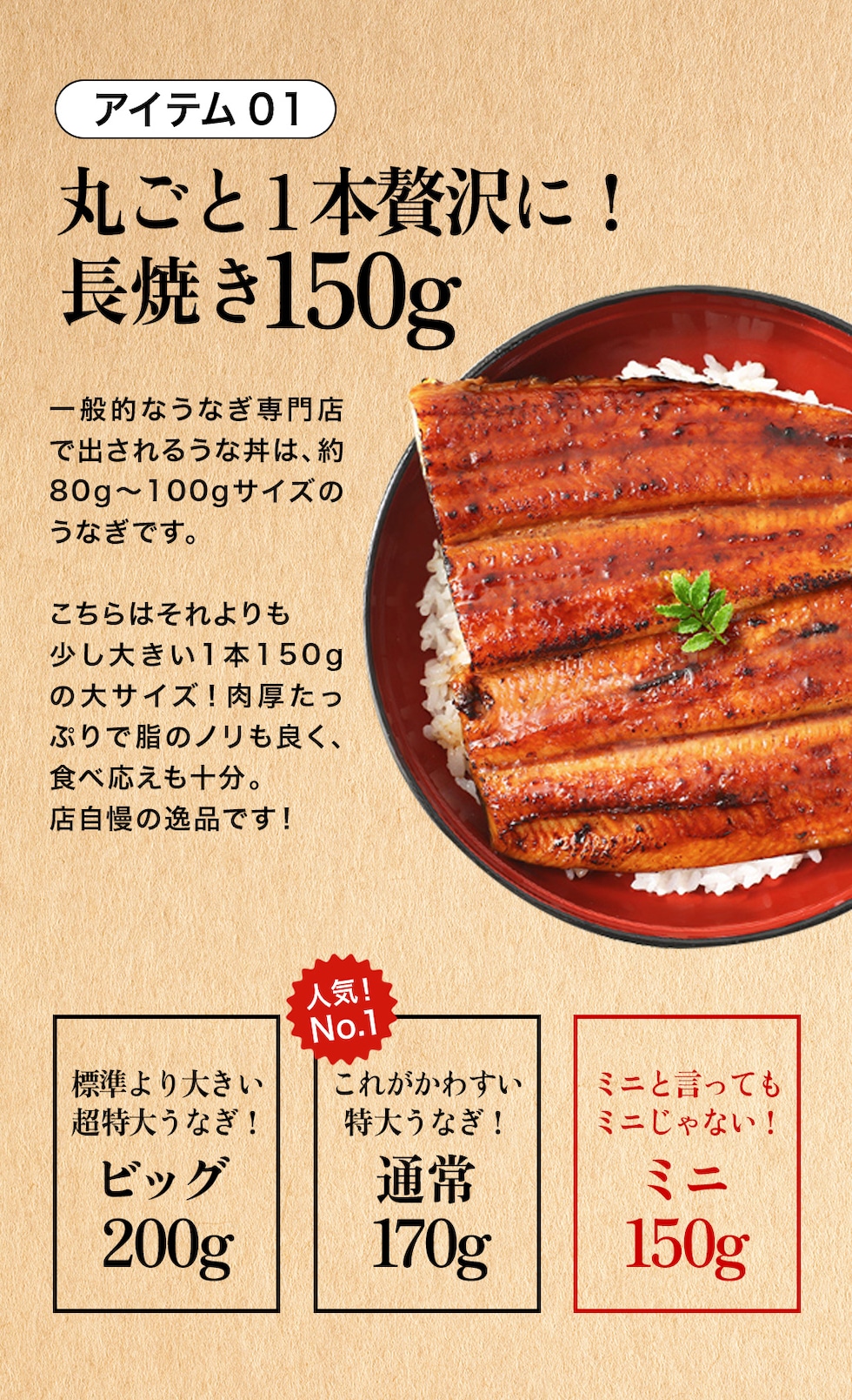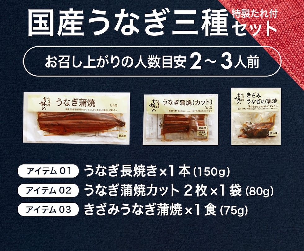・うなぎ蒲焼き 特大サイズ150g×1本 (たれ×2個) ・うなぎ蒲焼きカット2枚で80g (たれ×2個) ・きざみうなぎ蒲焼き75g×1食 (うなぎ50g、たれ25g) ・和歌山県産ぶどう山椒 小袋×5個 |