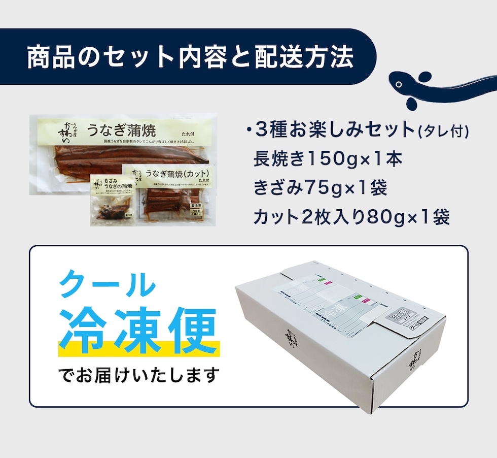 ・うなぎ蒲焼き 特大サイズ150g×1本 (たれ×2個) ・うなぎ蒲焼きカット2枚で80g (たれ×2個) ・きざみうなぎ蒲焼き75g×1食 (うなぎ50g、たれ25g) |