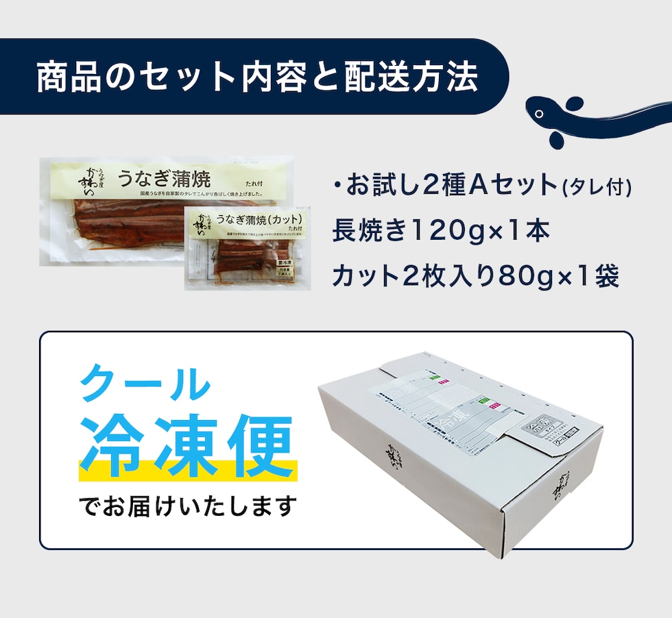 ・うなぎ蒲焼き120g×1本 (タレ2個) ・蒲焼きカット2枚で80g (タレ2個) |