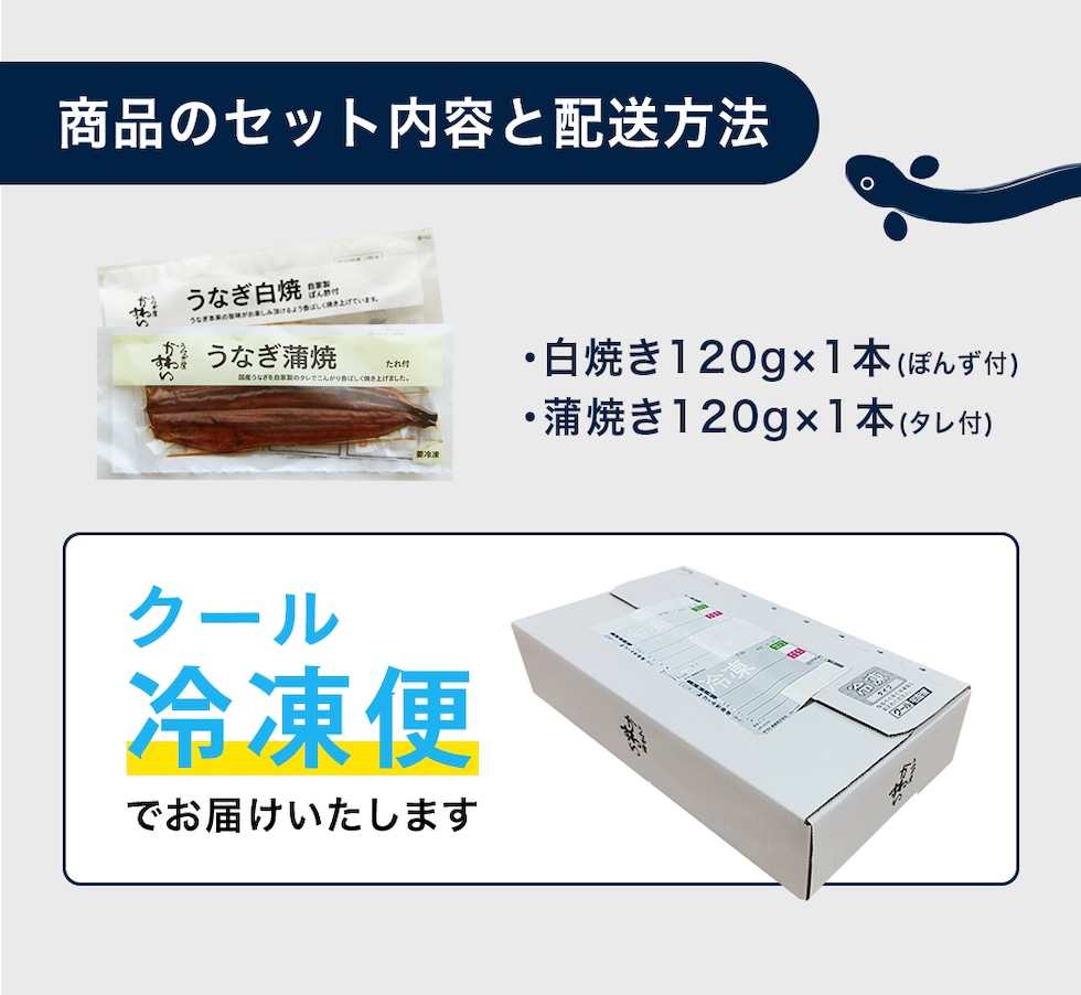 ・国産うなぎ白焼き120g×1尾 ・ぽんず1個 ・国産うなぎ蒲焼き120g×1尾 ・タレ2個 |
