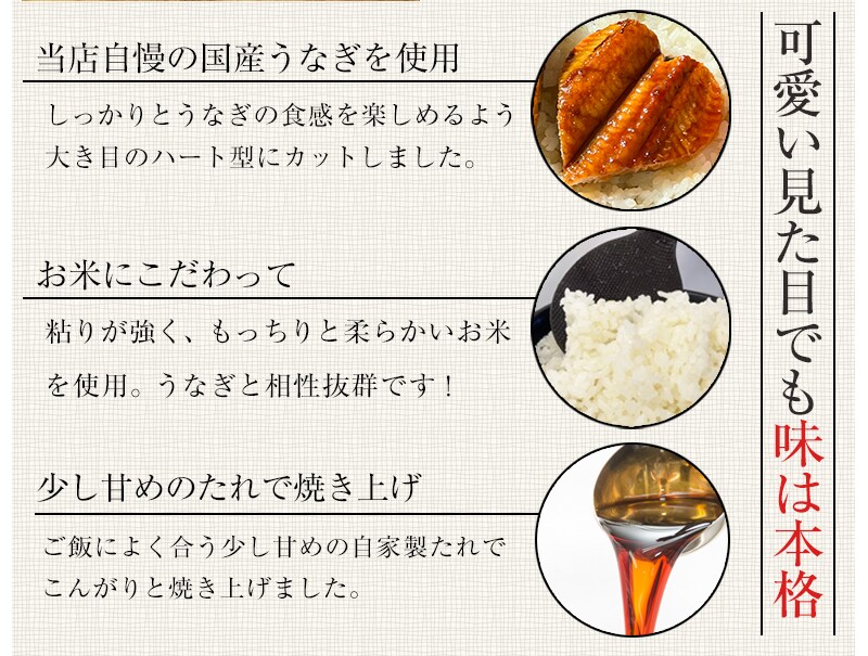 大切な人へ、ちょっと特別な“おいしい贈り物”を。 うなぎ蒲焼き専門店が丁寧に焼き上げた、ハート型のうなぎ焼きおにぎりです。 香ばしく焼き上げたごはんの中には、ふっくらとしたうなぎと、コク深い自家製タレ。 外はこんがり、中はしっとり。ひと口ごとに、やさしい旨みが広がります。 見た目のかわいらしさと、専門店ならではの本格的な味わい。 そのどちらも楽しめるから、もらった方の記憶に残る特別なギフトに。 お誕生日や記念日、ちょっとしたお礼やお祝いに。 甘いものが苦手な方への贈り物にもおすすめです。 「ありがとう」や「おめでとう」、そして「元気でいてね」の気持ちを込めて。 日常の中に、少しの驚きと笑顔を届ける うなぎ専門店のハートの贈り物をぜひどうぞ! |
