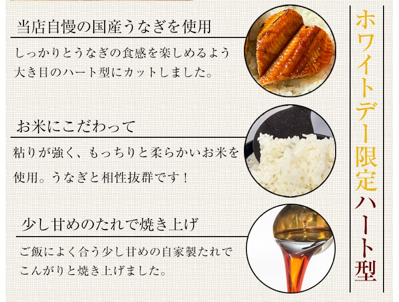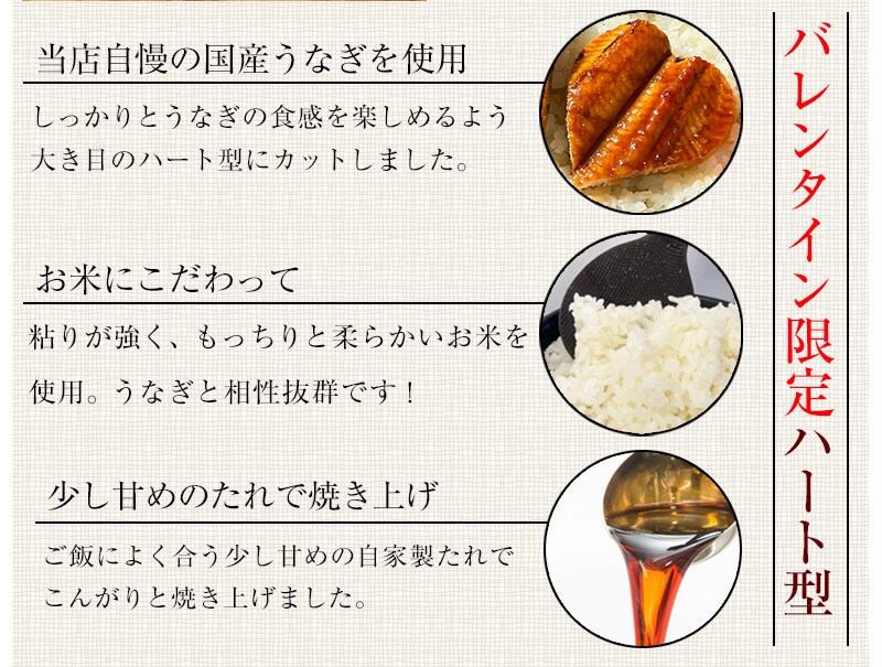 ・うなぎ蒲焼き ニホンウナギ、しょうゆ(大豆小麦を含む)、還元水あめ、発酵調味料、糖類(砂糖、ブドウ糖果糖液糖、水あめ)みりん、粉飴、でん粉、酵母エキス、(原材料の一部に大豆、小麦を含む) ・お米 国産米 ・焼き上げのタレ しょうゆ(大豆(遺伝子組み換えでない)、小麦を含む)発酵調味料、砂糖、みりん、うなぎエキス、酵母エキス | ||