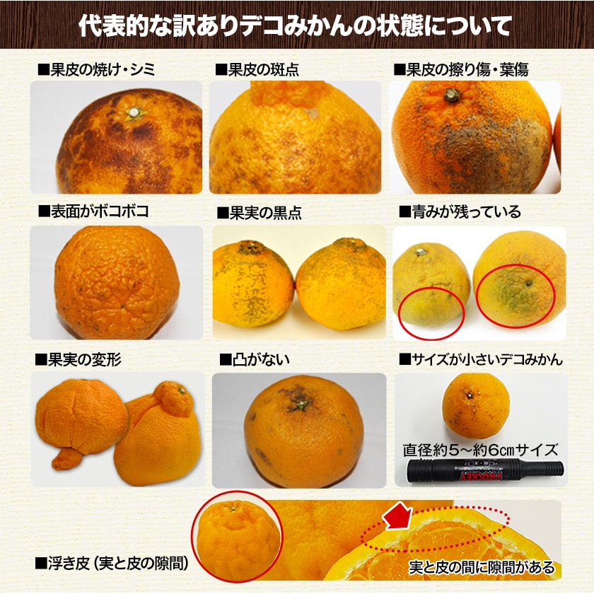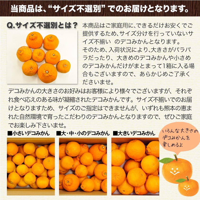 | 内容 | 訳ありデコみかん1.5kg ・サイズ不揃い ※玉数は、大きさにより変動します。 |