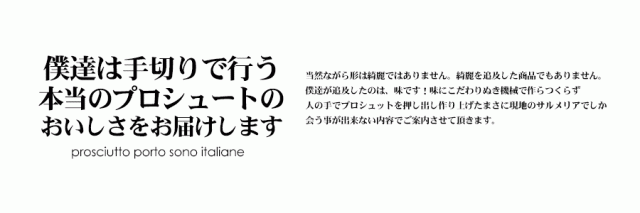 そんな僕達が作り手切りのプロシュートスライスは、現地サルメリア(サルメリアとは、いわゆるプロシュートだったら、サラミだったり、チーズだったり、チョッとグロサリー食材などなどを販売しているお店)にお買い物にいく感覚(サルメリアと変わらない味の提供)の物をご案内したいと思っているんです。そんな僕達がご提供させて頂くプロシュートは、本気でしっとりしております。こう考えて欲しい!それはプロシュートって、しっとりと脂身がとろけるイメージがあると思うのですが、そのイメージにほぼ近い物!一枚プロシュートを取り出し、お口に入れるとまずはふわっと、噛んでいくうちに熟成されたプロシュートの旨みが脂身と共にマリアージュされていくんです。更に薄切りにしているのでお口に中でモゴモゴしない、気が付いたら飲み込んでしまっているんです。もう一枚食べてもいーいww そんなプロシュートに仕上がております。
