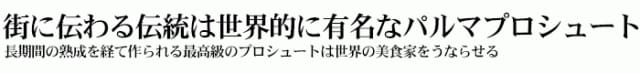 パルマ産のプロシュートが何故にこの時代まで長く受け継がれているとか考えてると、やっぱりそれは『旨い』から他ないのではないでしょう。そして低カロリーで良質なアミノ酸を多く含む健康食品としても知られております。 ※プロシュートの脂身の44%はオリーブオイルと同じ成分のオレイン酸と言われております。美味しいだけではなく、良質な脂身である事も広く知られるようになりました。