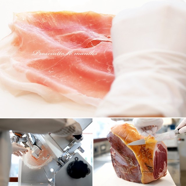 まず、プロシュットディパルマを原材料にスライス加工を行います。その加工の方法ですが、自動化された機械を使わず、手動のスライサーを使って個体別に大きさや形や硬さが違うプロシュートを人の手の感覚で感じ、手で押しながらスライスを行います。そして従来のプロシュートよりもより薄く、ふわっと仕上げます。もちろん窒素ガスもしれないし、炭酸ガスも入れません。現地サルメリアで買うのと同じおいしさを再現致します!!。