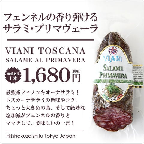 フェンネルの香りほとばしる最強系フィノッキオーナサラミ! ヴィアーニ社製サラミ・プリマヴェーラ200g ↑詳しくはコチラから |