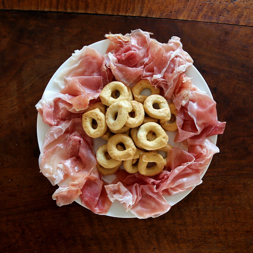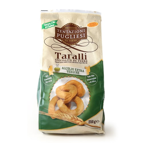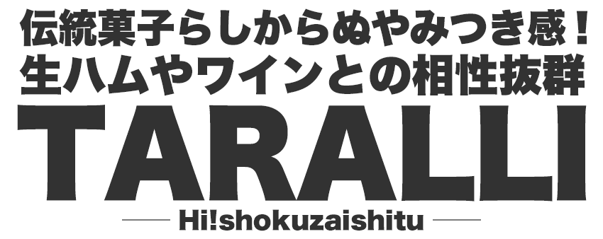 そのまま食べても美味しいタラッリですが、そのまま食べても美味しいタラッリですが…!グリッシーニと同じく、生ハムやサラミと組み合わて食べるのも当然美味しい!他にもトマトをのせて、南イタリア風の前菜っぽくしてみたり、チーズやオリーブとの相性抜群!さらには、塩気が強いということもあって、ビールやワインのお供にもオススメで御座います…と、いろいろとご紹介することはできるのですが、やっぱり気づくとそのままボリボリ食べていることが多かったり、しかも気づいたら袋のなかがほとんど空になっていたりする魅惑のお菓子で御座います。大人はもちろん、お子様にも喜んで頂ける南イタリアの伝統菓子。ぜひこの出会いに伝統菓子らしからぬやみつき感を持つ、南イタリアが誇るタラッリをご賞味頂ければと思います!
