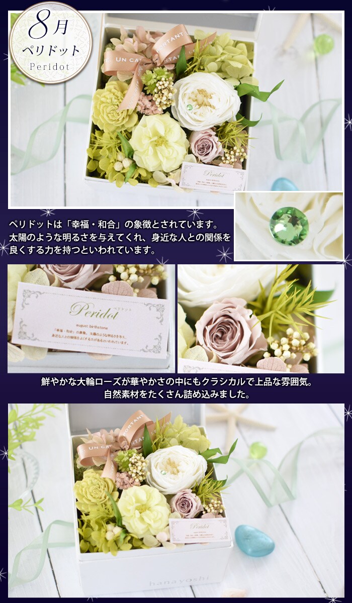 [7/15届~] プリザーブドフラワー hana*cube「8月ペリドット/白箱」【手提げ袋付】花由
