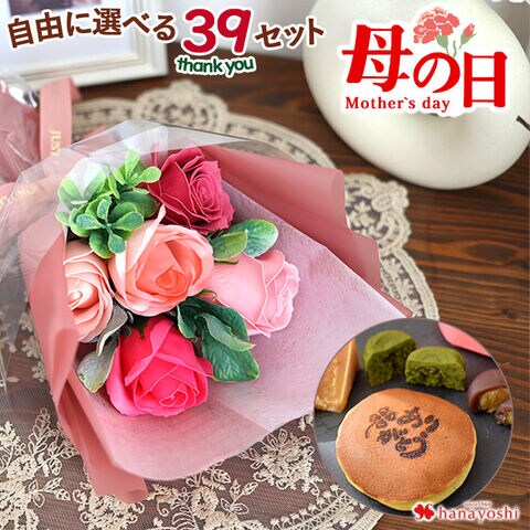 母の日 ギフト ソープフラワー【母の日ギフト2025】組合せ39通り 花とスイーツのセット ソープフラワー & 阿波の和菓子お楽しみ巾着【5月7~12日の間でお届け※当店おまかせ】※北海道・沖縄はお届け不可 花由